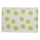 This pillowcase has a mid-century modern design of tan arches repeating on white as a background with repeating green-gold circles with darker green-gold starbursts inside them.