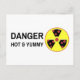 Radiation hazard symbol on the order of pizza and sausage slices. Danger - Hot and Yummy text. Funny and humourous design for good mood and Halloween party.