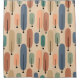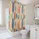 This shower curtain has a mid-century modern design of long ovals in peach, green, blue, teal, and light brown with black lines with circles on the ends.