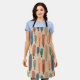 This apron has a mid-century modern design of long ovals in peach, green, blue, teal, and light brown with black lines with circles on the ends.