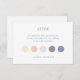 This stylish attire card features 5 colour dots which include a chic dusty blue, a blush pink rose, a pastel creamy peach and 2 shades of grey. The background, both front and back is a crsip white.