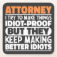 Funny Attorney Sayings "Attorney I Try To Make Things Idiot Proof But They Keep Making Better Idiots". Grab this Funny Attorney design as a funny gifts for an awesome mom, dad or friend.