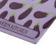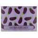 Eyecatching food patterned kitchen chopping board, printed with purple aubergine eggplants on a pale lilac background. There's a customisable text area for you to add a name or message or you can delete this if you prefer