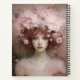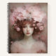 A gorgeous notebook featuring the portrait of a young woman with an enchanting innocence. This journal features a beautiful young woman with auburn coloured hair and pink flowers entwined through it. With porcelain skin, blush cheeks and dark olive green eyes, the portrait exhumes the beauty and innocence of youth.