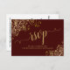 These beautiful RSVP cards will make it easy for your guests to respond to your wedding invitation. They feature an elegant design with gold script calligraphy on a chocolate brown or auburn coloured background, and lacy golden floral curls and swirls in the corners. The back of the card is a form for your guests to fill out and return indicating if they can attend or not, the number of guests they're bringing, and their choice of meals. There is also space for a website so your guests can respond online if it's more convenient for them.