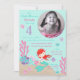 Little mermaid fourth birthday invitation card with underwater creatures.
