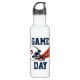 This spirited water bottle proudly showcases support for Auburn University on game day! It features a classic football helmet with the iconic blue "AU" logo, centred between the words "GAME" and "DAY" in bold blue lettering. A vibrant orange pennant extends from behind the helmet, proudly displaying a stylized tiger mascot face and the word "TIGERS." The design is set against a clean white background, making it an ideal way to stay hydrated while representing allegiance to the Auburn Tigers, whether at the game or on the go.