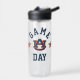 This spirited water bottle proudly showcases support for Auburn University on game day! It features the iconic Auburn "AU" logo prominently displayed at its centre, vibrant in its traditional orange and blue. Above and below the logo, the words "GAME" and "DAY" are boldly presented in blue, arched lettering, perfectly capturing the excitement of game day. Two vibrant orange stars with blue outlines flank the 'AU' logo, adding to the energetic display. This impactful and recognizable design is ideal for staying hydrated while representing allegiance to the Auburn Tigers, whether at the game or on the go.