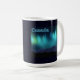 A multi-coloured, fractal rendering of the aurora borealis, or Northern Lights, superimposed on a digital painting of snow-covered mountains. Text reading "Canada" appears in glowing blue. Add your own additional text on the reverse side. The aurora borealis (or Northern Lights), named after the Roman goddess of dawn, Aurora, and the Greek name for the north wind, Boreas. Many cultural groups have legends about the lights. In medieval times, the occurrences of auroral displays were seen as harbingers of war or famine. The Maori of New Zealand shared a belief with many northern people of Europe and North America that the lights were reflections from torches or campfires. The Menominee Indians of Wisconsin believed that the lights indicated the location of manabai'wok (giants) who were the spirits of great hunters and fishermen. The Inuit of Alaska believed that the lights were the spirits of the animals they hunted: the seals, salmon, deer and beluga whales. Other aboriginal peoples believed that the lights were the spirits of their people. The connection between the Northern Lights and sunspot activity was suspected as far back as 1880. Thanks to research conducted since the 1950's, we now know that electrons and protons from the sun are blown towards the earth on the 'solar wind'. (Note: 1957-58 was International Geophysical Year and the atmosphere was studied extensively with balloons, radar, rockets and satellites. Rocket research is still conducted by scientists at Poker Flats, a facility under the direction of the University of Alaska at Fairbanks. The temperature of the sun's atmosphere is millions of degrees. At this temperature, collisions between gas molecules are frequent and explosive. Free electrons and protons are thrown from the sun's atmosphere by the rotation of the sun and escape through holes in the magnetic field. carried eartward in the solar wind, the charged particles are largely deflected by the earth's magnetic field. However, the earth's magnetic field is weaker at either pole and therefore some particles enter the earth's atmosphere and collide with gas particles in the higher layers (thermosphere). These collisions emit light that we perceive as the dancing lights of the north (and the south). Most aurorae occur in a band known as the auroral zone,which is typically 3° to 6° in latitudinal extent and at all local times or longitudes. The auroral zone is typically 10° to 20° from the magnetic pole defined by the axis of the Earth's magnetic dipole. During a geomagnetic storm, the auroral zone will expand to lower latitudes. The diffuse aurora is a featureless glow in the sky which may not be visible to the unaided eye even on a dark night and defines the extent of the auroral zone. The discrete aurora are sharply defined features within the diffuse aurora which vary in brightness from just barely visible to the unaided eye to bright enough to read a newspaper at night. Discrete aurorae are usually observed only in the night sky because they are as bright as the sunlit sky. Aurorae occasionally occur poleward of the auroral zone as diffuse patches or arcs (polar cap arcs, which are generally invisible to the unaided eye. Because the phenomena occurs near the magnetic poles, northern lights have been seen as far south as New Orleans in the western hemisphere, while similar locations in the east never experience the mysterious lights. However the best places to watch the lights (in North America) are in the northwestern parts of Canada, particularly the Yukon, Nunavut, Northwest Territories and Alaska. Auroral displays can also be seen over the southern tip of Greenland and Iceland, the northern coast of Norway and over the coastal waters north of Siberia. Southern auroras are not often seen as they are concentrated in a ring around Antarctica and the southern Indian Ocean. Auroral displays appear in many colours. Variations in colour are due to the type of gas particles that are colliding. The most common auroral colour, a pale yellowish-green, is produced by oxygen molecules located about 60 miles above the earth. Rare, all-red auroras are produced by high-altitude oxygen, at heights of up to 200 miles. Nitrogen produces blue or purplish-red aurora. The lights appear in many forms from patches or scattered clouds of light to streamers, arcs, rippling curtains or shooting rays that light up the sky with an eerie glow. Curtain-like structures show field lines in the Earth's magnetic field . The auroras that resulted from the "great geomagnetic storm" on both 28 August and 2 September 1859 are thought the most spectacular in recent recorded history. It was reported by the New York Times that in Boston on Friday 2 September 1859 the aurora was "so brilliant that at about one o'clock ordinary print could be read by the light". The aurora is thought to have been produced by one of the most intense coronal mass ejections in history, very near the maximum intensity that the Sun is thought to be capable of producing. It is also notable for the fact that it is the first time where the phenomena of auroral activity and electricity were unambiguously linked. This insight was made possible not only due to scientific magnetometer measurements of the era, but also as a result of a significant portion of the 125,000 miles (201,000 km) of telegraph lines then in service being significantly disrupted for many hours throughout the storm. Some telegraph lines, however, seem to have been of the appropriate length and orientation to produce a sufficient geomagnetically induced current from the electromagnetic field to allow for continued communication with the telegraph operator power supplies switched off. Both Jupiter and Saturn have magnetic fields much stronger than Earth's (Jupiter's equatorial field strength is 4.3 gauss, compared to 0.3 gauss for Earth), and both have large radiation belts. Auroras have been observed on both, most clearly with the Hubble Space Telescope. Ur