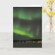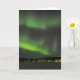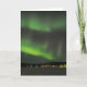 Greeting card with green rays of aurora borealis (northern lights) in the night sky over a frozen lake in Lapland.