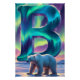Remplissez votre espace avec la beauté lumineuse du ciel arctique avec ce poster Lettre B Aurore. Une lettre B lumineuse s'élève au-dessus d'une clairière enneigée dans la forêt, illuminée par des rubans tourbillonnants de turquoise, de violet et d'émeraude des Aurores boréales. Le ciel rayonne de couleurs scintillantes, jetant des reflets doux sur la neige et mettant en valeur l'ours polaire paisible debout près de la base du monogramme.