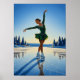 An elegant Art Deco oil painting of an ice skater in a striking emerald green costume, her sleek geometric form illuminated by the golden rim light of dawn as she glides across a polished, frozen lake.