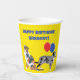 Create some doggone awesome personalized party supplies. These paper cups feature realistic style illustrations of Australian Shepherd dogs along with colourful party balloons against a bright yellow background. Your personalized message appears in royal blue lettering.