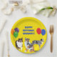 Create some doggone awesome personalized party supplies. These paper plates feature realistic style illustrations of Australian Shepherd dogs along with colourful party balloons against a bright yellow background. Your personalized message appears in royal blue lettering.