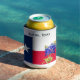 Can cooler designed with the Texas state flag and bluebonnets on one side and downtown Austin at dusk on the other. Red, white and blue colours throughout, for the patriotic look.