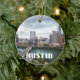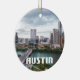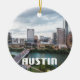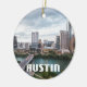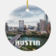 Austin, Texas city skyline photo with the bridge for a keepsake of downtown Austin. The name Austin is in white at the bottom in a modern font.