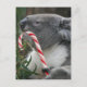 Photo features a koala bear sitting in a Eucalyptus tree eating a Christmas candy cane. Personalize by changing the background color and/or add your own photo and name or other text for a personal custom holiday gift from Australia.