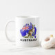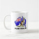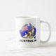 Australia is the smallest continent; between the South Pacific and the Indian Ocean. A kangaroo is superimposed on the flag filled map of Australia.
