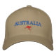 Fits well due to elastic edging, not adjustable. Good qualty material. Good quality embroidering. Subtle lettering (white on beige) just as my wife likes.