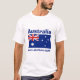 An editable title and slogan accompanies the white southern cross stars on the blue ensign of the Australian flag on the front of this t-shirt. The back displays a detailed map of Australia.