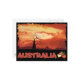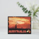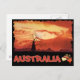 The design on this Postcard is orange clouds blown by the winds against a bright yellow australian sunset. A lone tree stands sillouetted in the forground in front of a mountain range spanning in the distance. This image is hand drawn using chalk pastels.