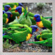 These bright coloured rainbow lorikeet birds are bright green, blue, red, and yellow. I took this photo of a large group of them feeding on the ground in Victoria Australia near Cape Otway.