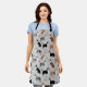 Cute Australian Shepherds / Aussie dogs in black, brown and merle coats sit and stand scattered dog bones and paw prints on a light grey background.