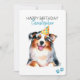 Happy Birthday with a personalized name. A cute Australian Shepherd puppy dog illustration with a birthday hat and balloons. Add your own message for a personal unique card. Art made with watercolors.