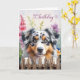 A lovely garden in the background with blooming Gladiolus flowers add colour to this sweet birthday card with an adorable Australian Shepherd dog peeking over a wooden fence.