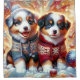 Celebrate the magic of winter with this charming artwork featuring two precious Australian Shepherd puppies dressed in their cutest winter attire. One puppy wears a red sweater with white snowflake patterns, while the other is similarly dressed in blue. They sit snug and cozy, watching their first snowfall amidst a festive scene with beautifully decorated Christmas trees. The falling snowflakes and warm holiday atmosphere make this design perfect for adding a touch of whimsy and warmth to any space.