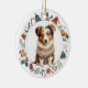 This cute Holiday ornament features a watercolor image of an adorable Australian Shepherd puppy dressed in his winter sweater. The image is framed within a colourful circle wreath made up of various Holiday images, including a snowman, bells, candy cane, stocking, holly, and more! The back of the ornament has the same wreath image with your custom text in green, gold, and red. See more Aussie images and products at Dog Village.