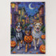 Adorable Australian Shepherds dressed in playful Halloween costumes carry pumpkin buckets while trick-or-treating under the moonlit sky. This festive design highlights the breed’s fluffy coat, intelligent eyes, and playful personality, perfectly capturing the spooky yet fun atmosphere of Halloween night. A delightful celebration for dog lovers and Halloween fans alike.