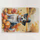 A watercolor-style painting of a cheerful dog sitting amidst a pile of vibrant fall leaves, surrounded by tiny pumpkins and scattered acorns. The dog wears a little pilgrim hat and beams with joy, capturing the spirit of Thanksgiving. In the background, soft harvest fields and golden-hued trees create a peaceful countryside ambiance. Gentle textures and warm, muted autumn tones give the scene a cozy, nostalgic feel perfect for celebrating the beauty of the season.