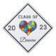 Autism Awareness Graduation Mortar Board Cap tassel topper has a heart filled with puzzle pieces. Edge of topper has a black stripe going around. Personalized with the year of graduation and the graduates name in black against a white background.