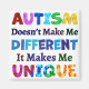 Inspirational quote of “AUTISM Doesn't Make Me DIFFERENT, It Makes Me UNIQUE” with colourful Autism puzzles to support and advocate Autism Awareness.