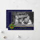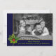 Your colour photo will be automatically converted to a stylish black and white image when uploaded to this modern clean photo Christmas card design. Your family photo filling the card face behind a blue and gold frame highlighted with a pine and holly bough. Bottom band holds your names and Christmas greeting in a soft green font. Sparkling gold Merry Christmas pattern on back against a dark Christmas blue.