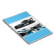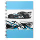 Notebook is shown with a photo print of a auto race car.