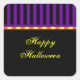 Un autocollant personnalisé avec Happy Halloween dans des lettres de script désordonnées personnalisées. L'arrière - plan a des rayures orange et jaune sur un arrière - plan rayé noir et violet. Cliquez sur Customiser pour modifier les polices, le dimensionnement et plus.