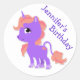 stickers d'anniversaire de fille douce, avec une caricature violette unicorne et texte personnalisé violet. Personnalisez le texte, pour l'anniversaire de votre enfant. Des serviettes en papier, des invitations et des gâteaux assortis sont disponibles.