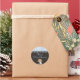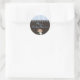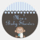 Cet autocollant de Baby shower personnalisable moderne comporte un singe sur un arrière - plan rayé bleu et marron. Customisez-le en ajoutant vos détails dans la police de votre choix !