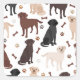 Chiens adorables Labrador Retriever aux couleurs noir, chocolat, rouge et jaune. Chiens de laboratoire avec des empreintes de pattes et des os de chien motif.
