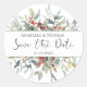 Cette conception présente une illustration de feuillage vert et de baies rouges dans le style aquarelle. Personnalisez avec vos noms et date de mariage. Le texte "Sauver la date" est écrit dans une police de script.