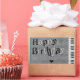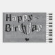 Le JOYEUX ANNIVERSAIRE de mots dans le lettrage noir et blanc en plastique. Les coeurs d'amour et les notes de musique sont autour du lettrage. L'arrière - plan est gris avec une feuille de musique se fanant doucement derrière lui. Les clés de piano fonctionnent en bas du côté droit de l'image.