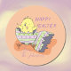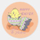 Un autocollant rond orange clair représentant un poussin mignon clignant des yeux sortant d'un œuf décoré. Le texte indique "Joyeuses Pâques" . Personnalisez-le avec le nom de votre famille . Parfait pour sceller des enveloppes ou décorer des cadeaux .