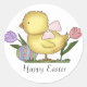 Belle oeuvre primitive de campagne d'un poussin jaune à l'aspect moelleux, avec un joli arc rose. La poussette est entourée de fleurs colorées et d'un oeuf de Pâques peint. Le texte ci-dessous indique Joyeux Pâques, et peut être customisé à lire tout ce que vous voulez. Joli autocollant de Pâques idéal pour les enfants ou comme enveloppes scellées pour vos cartes de voeux de Pâques.