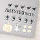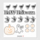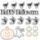 Autocollants coupés orientés de Halloween. Jack-o'-lantern orange (1 grand, 4 petits). Reste dans le noir : 5 chats, 5 sorcières volantes, un fantôme, et texte "Halloween heureux"