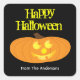Cet autocollant d'étiquette de cadeau de Halloween a un citrouille découpé sur un arrière - plan noir avec les mots : Halloween heureux au dessus en jaune lumineux et à la pièce au fond de personnaliser avec votre nom.