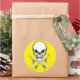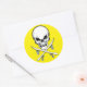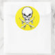 Autocollant rond avec crâne et os croisés - avec les os convertis en skateboards - pour un tour iconique unique, contre un arrière - plan jaune vif. Recueillez-les toutes.