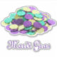 Autocollant vinyle taillé sur mesure avec une image de pièces en plastique métallique mardi Gras violet, vert et or et "Mardi Gras" en écriture violette française. Voir toute la collection Mardi Gras Sticker dans les INVITATIONS | Section Stickers & Étiquettes.