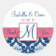 Sticker en Merci bleu et blanc marine en Mariage damassé couleur rose et monogramme initial. Conception par Elke Clarke©. Carte graphique sous licence. Vous avez besoin d'une couleur différente ou d'aide, veuillez contacter luxuryweddinginvitations@gmail.com
